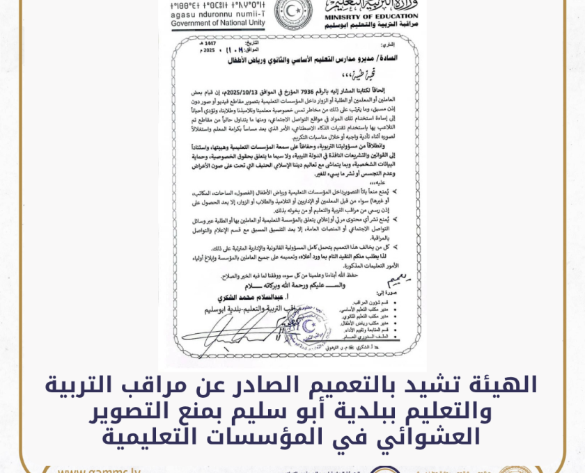 تشيد الهيئة العامة لرصد المحتوى الإعلامي بالتعميم الصادر عن السيد مراقب التربية والتعليم ببلدية أبو سليم، الأستاذ عبد السلام محمد الشكري، ا…