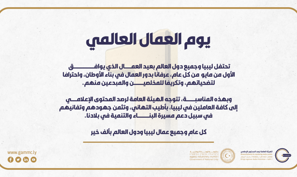 تحتفل ليبيا وجميع دول العالم بعيد العمال الذي يوافق الأول من مايو من كل عام، عرفانًا بدور العمال في بناء الأوطان، واحترامًا لتضحياتهم، وتكريمًا للمخلصين والمبدعين منهم. وبهذه المناسبة، تتوجه الهيئة العامة لرصد المحتوى الإعلامي إلى كافة العاملين في ليبيا، بأطيب التهاني، وتثمن جهودهم وتفانيهم في سبيل دعم مسيرة البناء والتنمية في بلادنا. كل عام […]