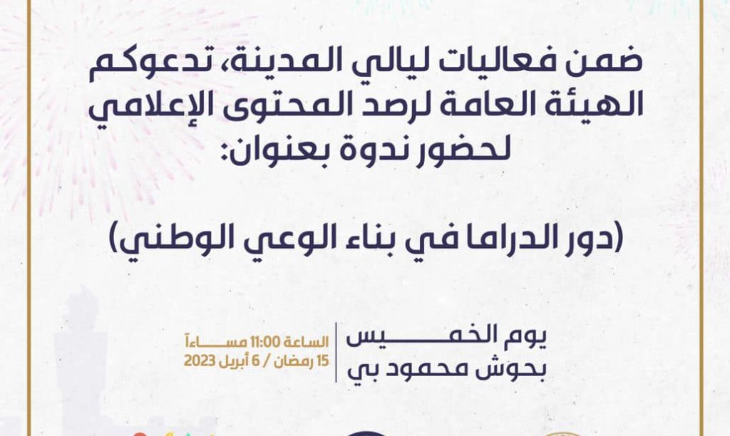 ضمن فعاليات ليالي المدينة، تدعوكم الهيئة العامة لرصد المحتوى الإعلامي لحضور ندوة بعنوان: (دور الدراما في بناء الوعي الوطني) وفق المحاور التالية: – دور الدراما التاريخية في تعزيز الانتماء – دور الدراما الاجتماعية في تعزيز قيم السلام – الإخلالات المهنية في الأعمال الدرامية الرمضانية – أهمية الدورات التدريبية في إعداد الممثل. – الاتصال الوجداني بين […]