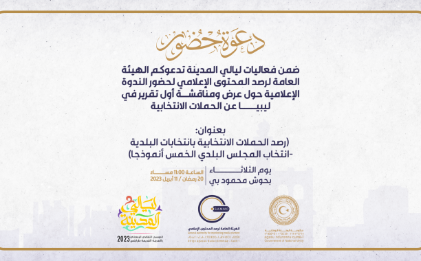 طرابلس | 11 أبريل 2023م عقدت الهيئة العامة لرصد المحتوى الإعلامي الثلاثاء ضمن فعاليات ليالي المدينة بطرابلس ندوة إعلامية استعرضت خلالها نتا…