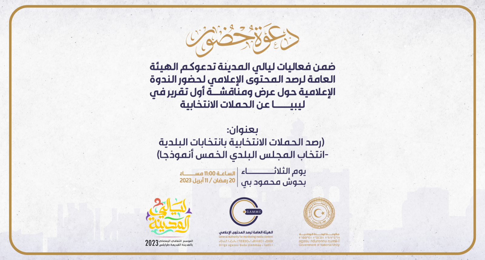 ضمن فعاليات ليالي المدينة تدعوكم الهيئة العامة لرصد المحتوى الإعلامي لحضور الندوة الإعلامية حول عرض ومناقشة أول تقرير في ليبيا عن الحملات ا…