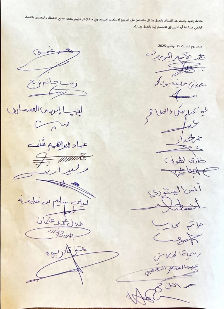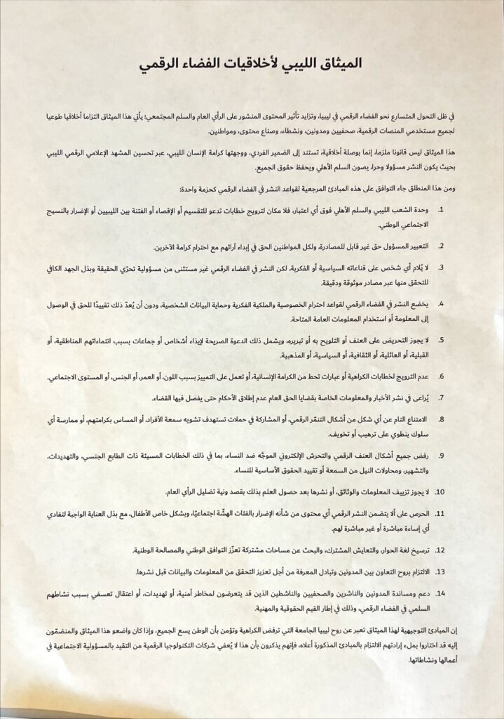 ويهدف الميثاق إلى أن يكون التزامًا أخلاقيًا طوعيًا يمثل بوصلة للممارسة المسؤولة والحرة في الفضاء الرقمي الليبي، تصون السلم الأهلي وتحفظ حقوق المواطنين، مؤكداً أنه ليس قانوناً ملزماً.